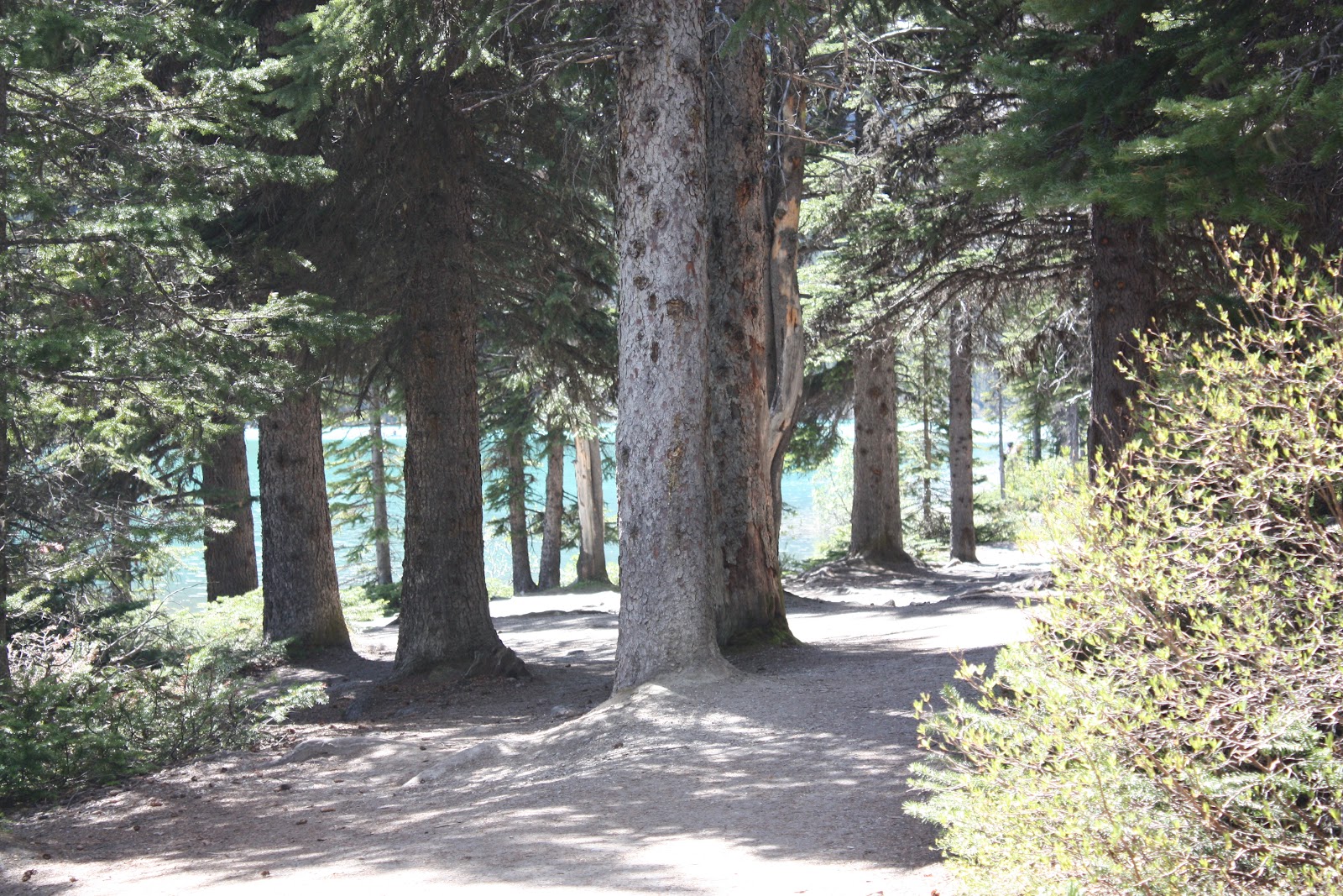 | The lake front path. The blue lake peeking through the trees. |
